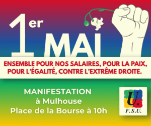 Manifestation du 1er mai à Mulhouse ! 2026-04-21T08:58:06+02:0021 avril 2026|Catégories : À LA UNE| Partagez cet article ! FacebookXWhatsAppTelegramEmail Articles similaires Appel 1er mai : Du pain, la paix et la liberté ! Appel 1er mai : Du pain, la paix et la liberté ! 17 avril 2026 Déclaration liminaire de la FSU au CSA MEN du 14 avril 2026 Déclaration liminaire de la FSU au CSA MEN du 14 avril 2026 15 avril 2026 Rémunérations des personnels la fonction publique : l’urgence de mesures salariales ambitieuses ! Rémunérations des personnels la fonction publique : l’urgence de mesures salariales ambitieuses ! 15 avril 2026 Non au passage en force sur le 1er mai ! Non au passage en force sur le 1er mai ! 12 avril 2026 Liminaire FSU 68 – CDEN 9 avril 2026 Liminaire FSU 68 – CDEN 9 avril 2026 10 avril 2026
